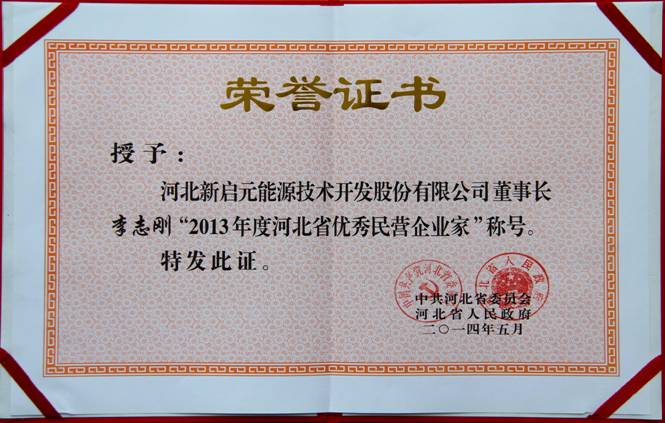6月5日,中共河北省委、河北省人民政府授予新啟元公司“河北省2013年度百?gòu)?qiáng)民營(yíng)企業(yè)”榮譽(yù)稱(chēng)號(hào)。授予新啟元公司董事長(zhǎng)李志剛“2013年度河北省優(yōu)秀民營(yíng)企業(yè)家”榮譽(yù)稱(chēng)號(hào)。