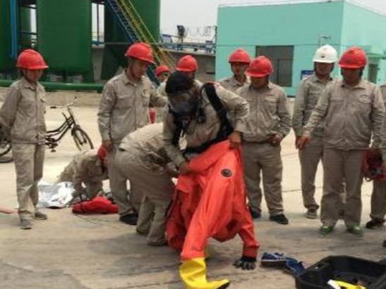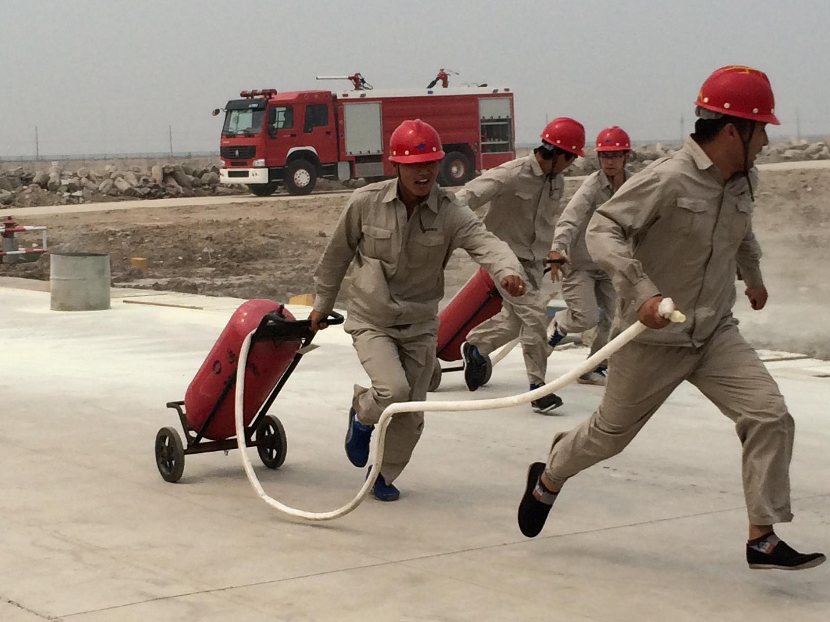 比賽共設(shè)三個(gè)項(xiàng)目:滅火器使用比賽、消防水帶使用比賽、空氣呼吸器及防化服穿戴比賽。健康安全環(huán)保部經(jīng)理孫長(zhǎng)輝任總指揮,公司副總經(jīng)理劉立新現(xiàn)場(chǎng)指導(dǎo),中捷安監(jiān)局科長(zhǎng)宋魁作為嘉賓也來(lái)到了現(xiàn)場(chǎng)。