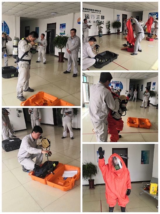 安全比武活動內容分別為空氣呼吸器穿戴及防護服穿戴,此活動重點檢驗員工對應急器材的掌握情況,以及在突發(fā)應急情況下快速準確穿戴防護用品的能力。比賽期間,參賽選手緊抓比賽要點,梳理檢查、佩戴、調整、確認四個操作環(huán)節(jié),不時對佩戴技巧和要點難點進行交流,共同探討如何提升安全技能水平。