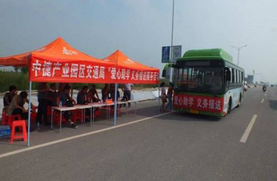 此次活動(dòng)我公司共出動(dòng)公交車2輛,出租車20輛,并且有運(yùn)政、路政共10名執(zhí)法人員參加,公交車和出租車的LED屏上顯示著醒目的“愛心助學(xué),義務(wù)接送”信息,并在黃驊汽車站設(shè)立了專門的服務(wù)臺(tái)和工作人員,引導(dǎo)遠(yuǎn)道而來的家長(zhǎng)和新生免費(fèi)乘車。工作人員幫新生提行李、引路,及時(shí)將新生和家長(zhǎng)送到早已等候的班車,然后一站式送達(dá)至學(xué)校。此次義務(wù)接送農(nóng)大新生入學(xué)活動(dòng),得到廣大新生和家長(zhǎng)們一致好評(píng)。