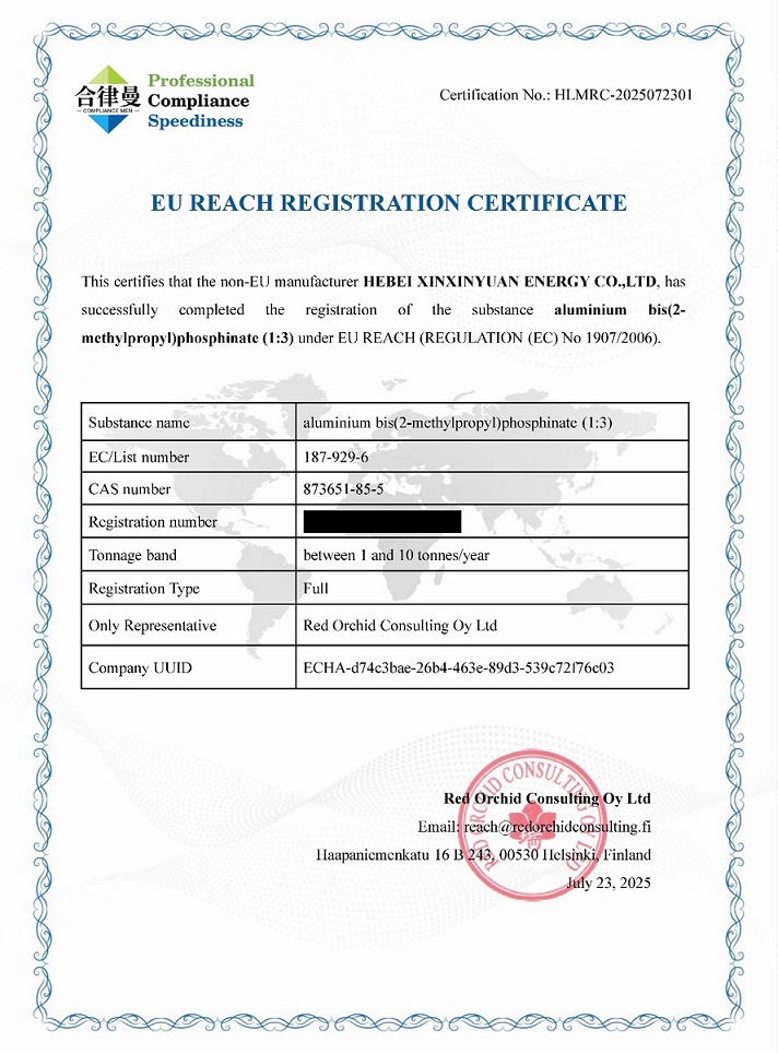 此次二異丁基次磷酸鋁產(chǎn)品REACH領(lǐng)頭注冊(cè),不僅標(biāo)志著新欣園公司成為全球首家獲得該產(chǎn)品歐盟市場(chǎng)準(zhǔn)入資格的企業(yè),更意味著向歐盟官方提交的新一代無(wú)鹵磷系阻燃劑的健康環(huán)保測(cè)試數(shù)據(jù)得到全部認(rèn)可,充分驗(yàn)證了該產(chǎn)品在性能指標(biāo)、安全規(guī)范及環(huán)境友好性方面全面達(dá)到國(guó)際頂尖水準(zhǔn)的核心競(jìng)爭(zhēng)力,彰顯了企業(yè)在綠色材料創(chuàng)新與標(biāo)準(zhǔn)化建設(shè)方面的行業(yè)領(lǐng)導(dǎo)地位,顯著增強(qiáng)了新欣園公司在高端應(yīng)用市場(chǎng)的競(jìng)爭(zhēng)優(yōu)勢(shì),為全球合作伙伴提供了技術(shù)可靠、品質(zhì)穩(wěn)定的材料解決方案。
